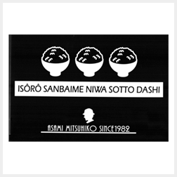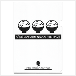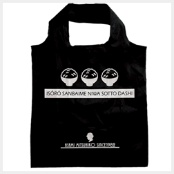「居候三杯目にはそっと出し」の川柳と3杯のご飯茶碗をプリントした、大きめのエコバッグ。米粒はよくみると浅見の年齢と同じ「33」になっているデザイン!